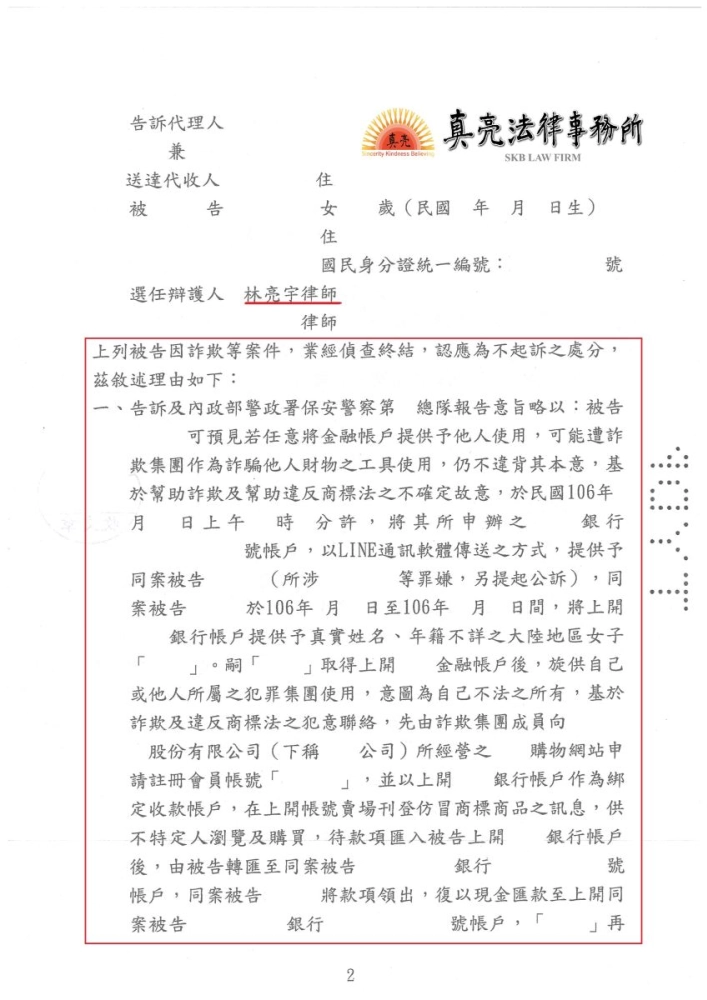 經當事人求助真亮法律事務所所長林亮宇律師,林亮宇律師認為本案需要讓檢察官充分了解金流,研究後認為當事人可以帳號內金錢的往來主張並無參與詐欺之犯意,開庭時並要求檢察官調查對當事人有利證據,後續也成功說服檢察官,歷經近二年偵辦,終獲檢察官作成【不起訴】處分【確定】。