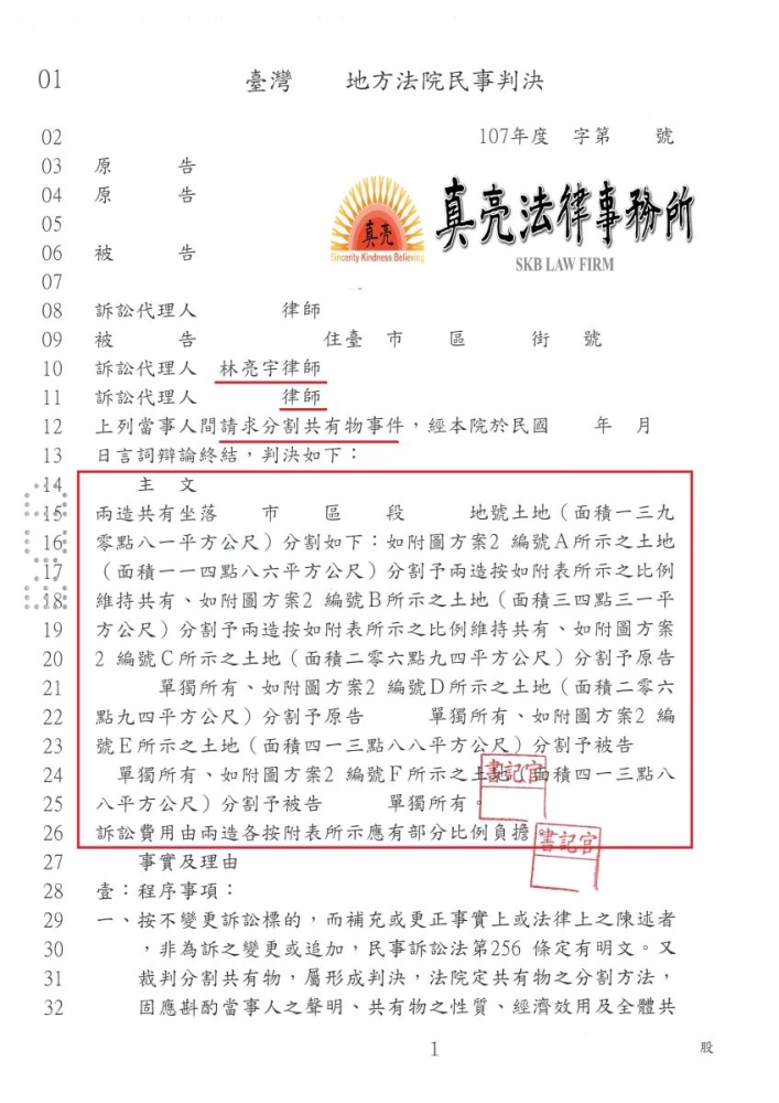 真亮法律事務所近期承辦一個案件,共有人提出土地分割訴訟,但提出之分割方案對於當事人極不合理,經客戶尋求真亮法律事務所協助,所長林亮宇律師與所內律師分析實際狀況之後,建議依照地形、區位等提出我方分割方案,並預留合理的通行道路,才能保障我方權益,於法官現勘及開庭時均詳細說明採用我方分割方案之理由,最後判決之分割方式,多數均採用我方合理分割方式,也因此能夠保障當事人權利。
