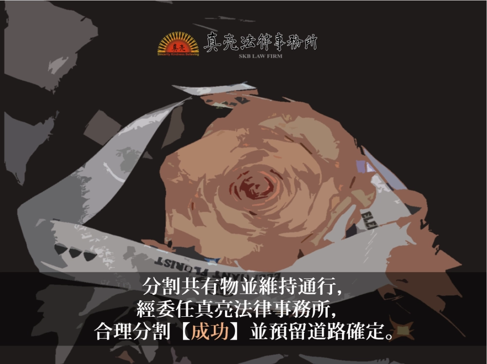 「分割共有物並維持通行,經委任真亮法律事務所,合理分割【成功】並預留道路確定。」由真亮法律事務所製作,以創用CC 姓名標示-非商業性-相同方式分享 4.0 國際 授權條款釋出。