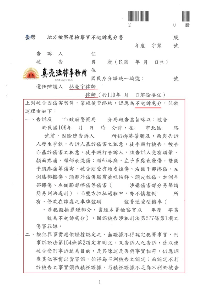 經當事人求助真亮法律事務所所長林亮宇律師,林亮宇律師認為本案要詳述事發過程,並且要傳喚其他的路人為證人,才能釐清真相。開庭時並協助詳細說明案發經過,後續也成功說服檢察官,獲檢察官作成【不起訴】處分【確定】。