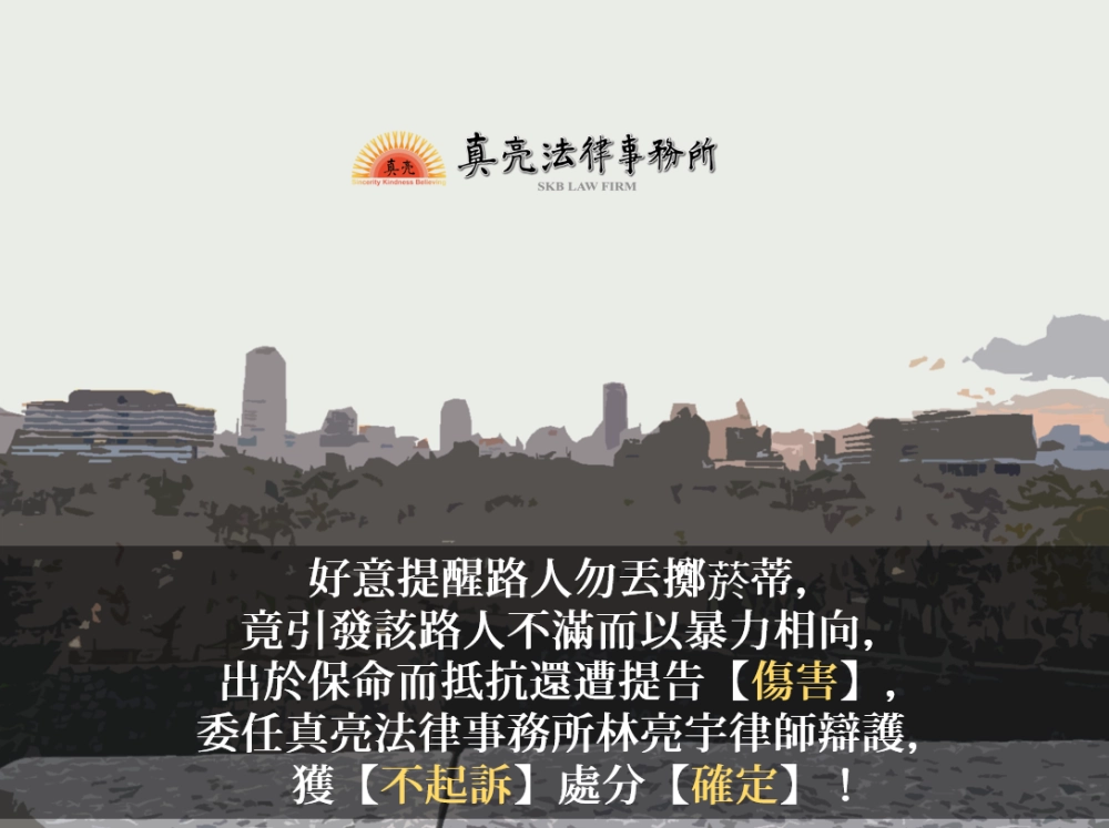 「好意提醒路人勿丟擲菸蒂,竟引發該路人不滿而以暴力相向,出於保命而抵抗還遭提告【傷害】,委任真亮法律事務所林亮宇律師辯護,獲【不起訴】處分【確定】!」由真亮法律事務所製作,以創用CC 姓名標示-非商業性-相同方式分享 4.0 國際 授權條款釋出。