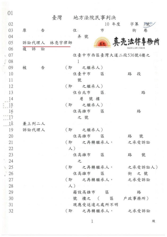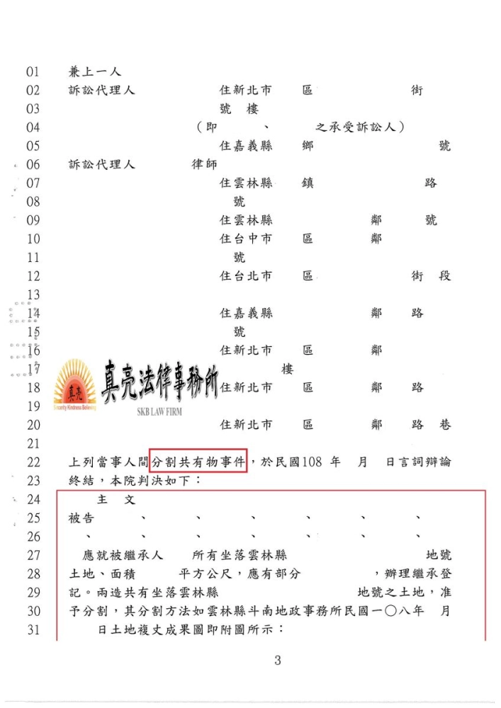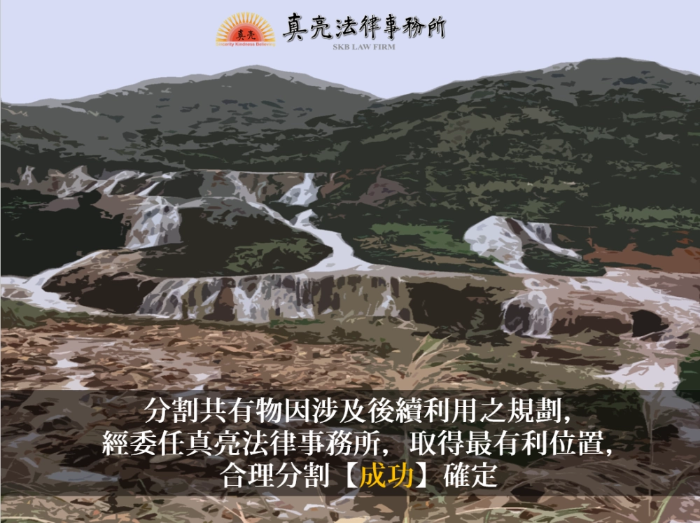 「分割共有物因涉及後續利用之規劃,經委任真亮法律事務所,取得最有利位置,合理分割【成功】確定。」由真亮法律事務所製作,以創用CC 姓名標示-非商業性-相同方式分享 4.0 國際 授權條款釋出。