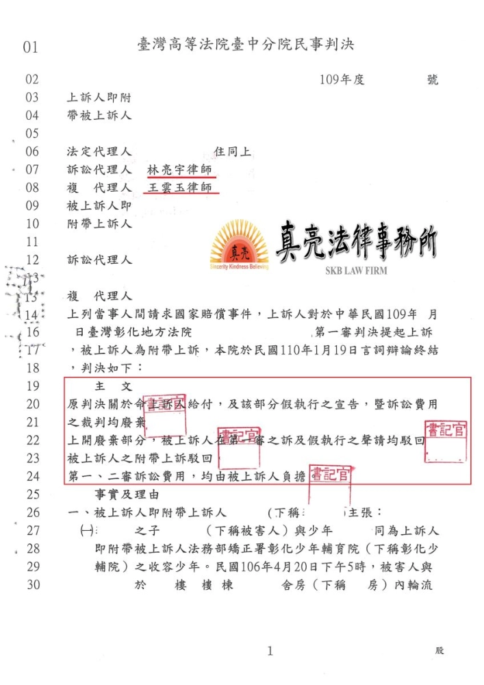 真亮法律事務所近期承辦一個案件,某機關因為業務上需要拘束人民的自由,因此有專人負責管理巡察,某日因為被拘束人之間發生爭議,肢體產生衝突,因為設備老舊無法即時巡察發現,於發現後有立即送醫,但很遺憾還是發生死亡之結果,出手打人之人之後刑事上有被判刑、民事上也判決應負責損害賠償。死亡之家屬另外提出國家賠償申請,機關認為沒有過失而拒絕,第一審民事法院認定機關設備老舊且有過失,而判決機關要負擔國家賠償責任。經機關尋求真亮法律事務所協助,所長林亮宇律師與所內律師分析實際狀況之後,認為可以主張國家賠償之要件除了設施有欠缺以外,還要考慮損害的結果與設施欠缺間有無「因果關係」,並於法官開庭時說明法醫報告有關死亡的原因,實際上與設施間無「因果關係」,最後第二審法院採納我方主張,第二審法院判決【駁回】原告請求,【成功】逆轉【勝訴】。