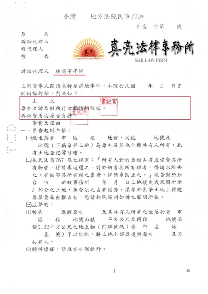 「地主談好土地買賣後悔,竟提出拆屋還地訴訟,經委任真亮法律事務所,判決【成功】阻止拆屋確定。」由真亮法律事務所製作,以創用CC 姓名標示-非商業性-相同方式分享 4.0 國際 授權條款