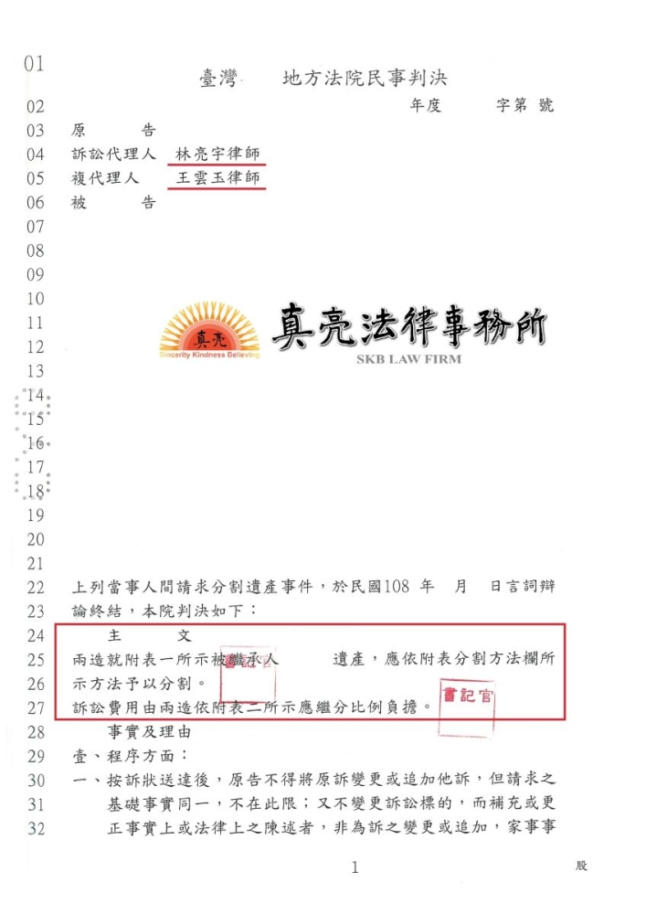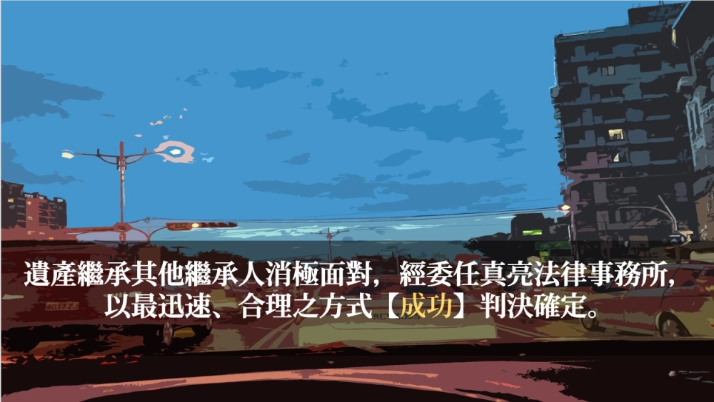 「遺產繼承其他繼承人消極面對,經委任真亮法律事務所,以最迅速、合理之方式【成功】判決確定。」由真亮法律事務所製作,以創用CC 姓名標示-非商業性-相同方式分享 4.0 國際 授權條款釋出。