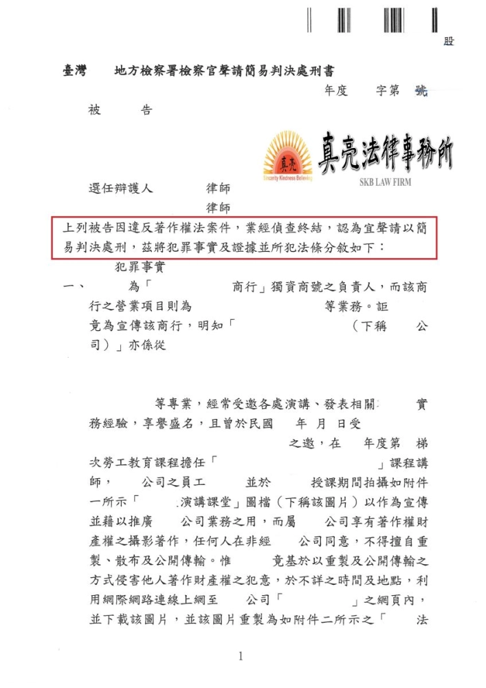 「同業網路行銷竟盜用他人公司網頁照片,侵害著作權,經委託真亮法律事務所提出告訴,該同業遭【起訴】並【判刑】確定!」由真亮法律事務所製作,以創用CC 姓名標示-非商業性-相同方式分享 4.0 國際 授權條款釋出。