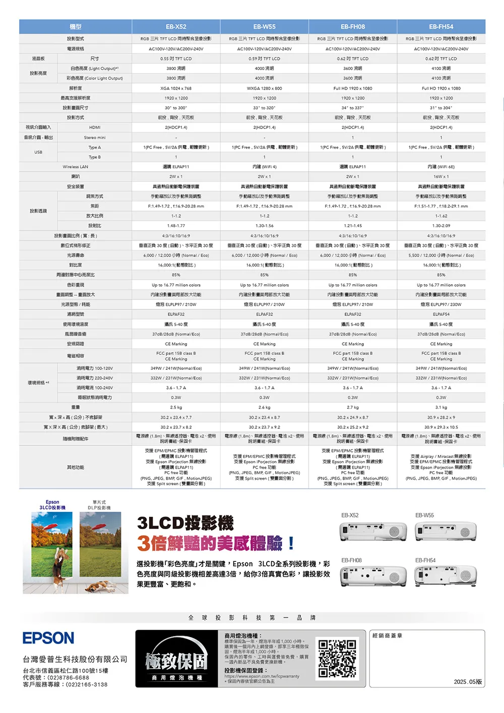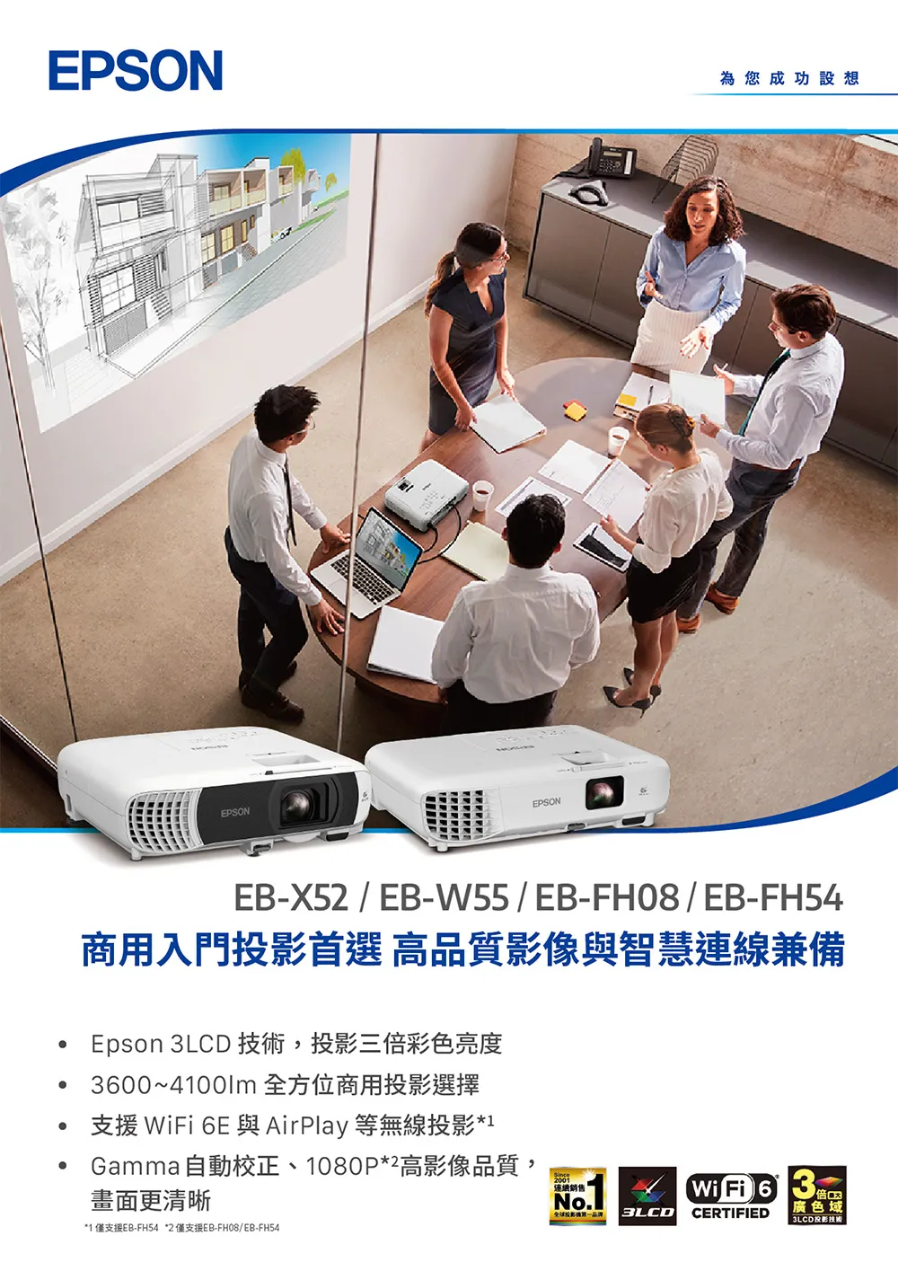 挑選投影機除了注意白色亮度(根據全白區塊所測量的亮度)是否符合標準,例如使用ANSI或是ISO之外,更需要注意是否標註彩色亮度。全新Epson EB-X52商用投影機,採用3LCD投影技術,「白色亮度」及「彩色亮度」都達到3800流明,不必犧牲環境光源,看得更舒適。