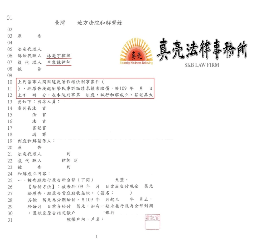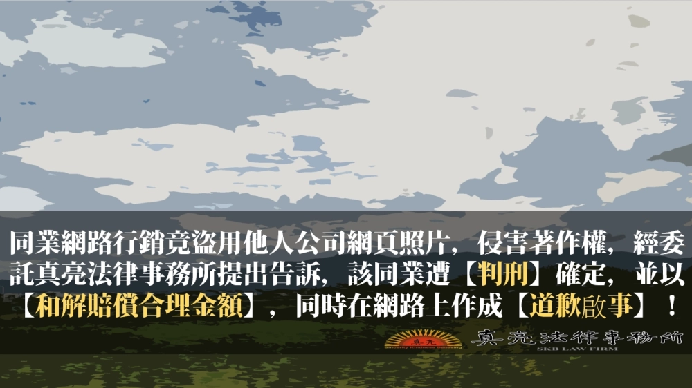 「同業網路行銷竟盜用他人公司網頁照片,侵害著作權,經委託真亮法律事務所提出告訴,該同業遭【判刑】確定,並以【和解賠償合理金額】,同時在網路上作成【道歉啟事】」由真亮法律事務所製作,以創用CC 姓名標示-非商業性-相同方式分享 4.0 國際 授權條款釋出。