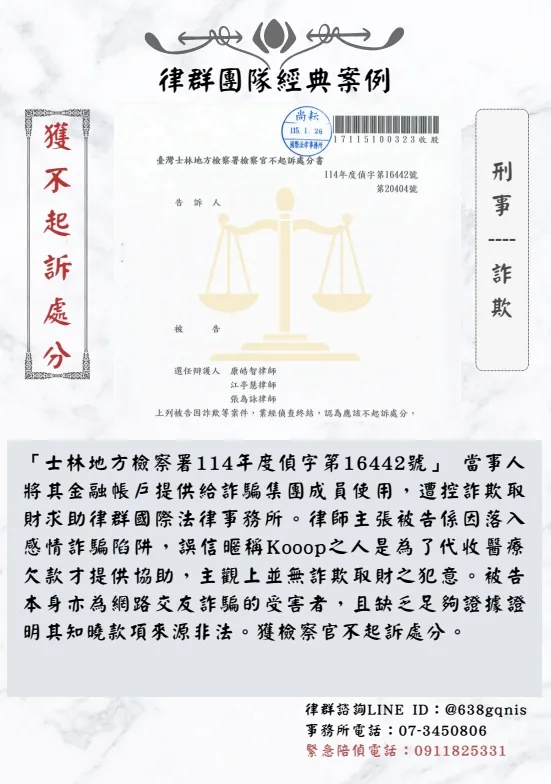 「士林地方檢察署114年度偵字第16442號」 當事人將其金融帳戶提供給詐騙集團成員使用,遭控詐欺取財求助律群國際法事務所。律師主張被告係因落入感情詐騙陷阱,誤信暱稱Kooop之人是為了代收醫療欠款才提供協助,主觀上並無詐欺取財之犯意。被告本身亦為網路交友詐騙的受害者,且缺乏足夠證據證明其知曉款項來源非法。獲檢察官不起訴處分。