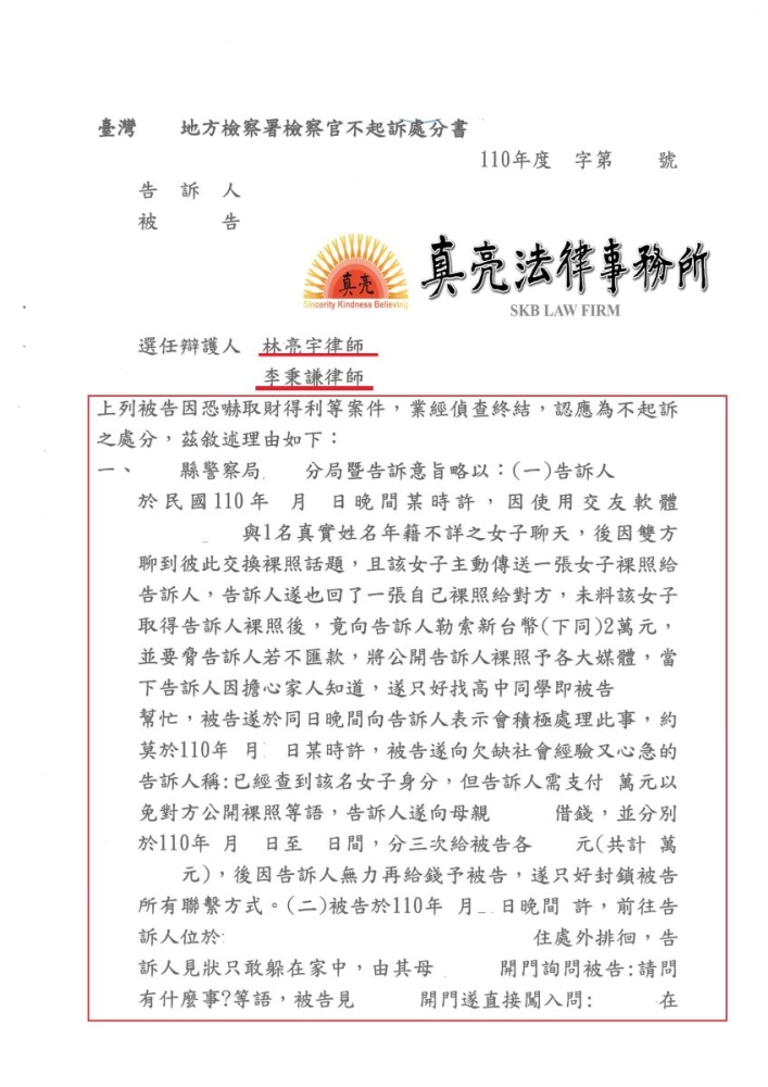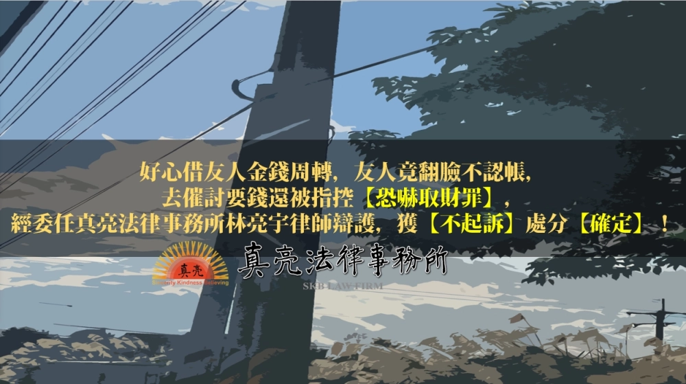 「好心借友人金錢周轉,友人竟翻臉不認帳,去催討要錢還被指控【恐嚇取財罪】,經委任真亮法律事務所林亮宇律師辯護,獲【不起訴】處分【確定】!」由真亮法律事務所製作,以創用CC 姓名標示-非商業性-相同方式分享 4.0 國際 授權條款釋出。
