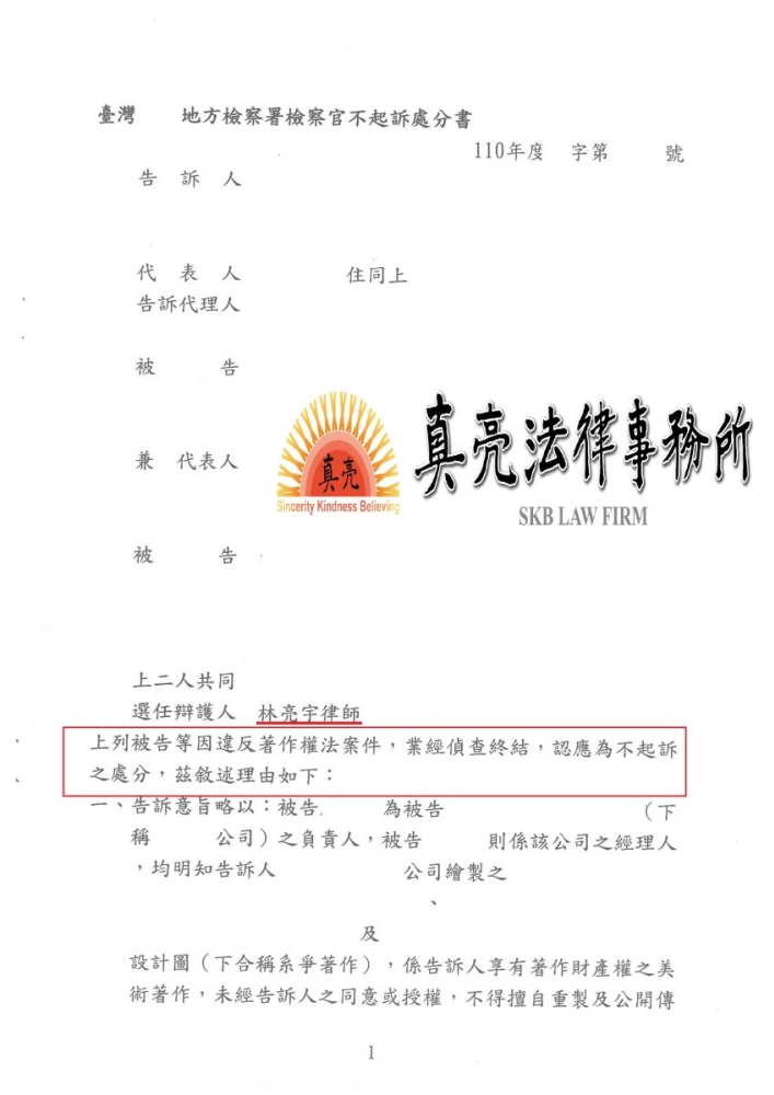 經當事人求助真亮法律事務所所長林亮宇律師,林亮宇律師分析,業主與廣告公司間已經有契約、報價單、付款單,依著作權法規定,業主本來就有使用相關文案的權利,與契約爭議無關。偵察程序進行時,經律師說明業主本來就是有權使用,根本沒有侵害著作權的問題,經檢察官採納,作成【不起訴】處分確定。