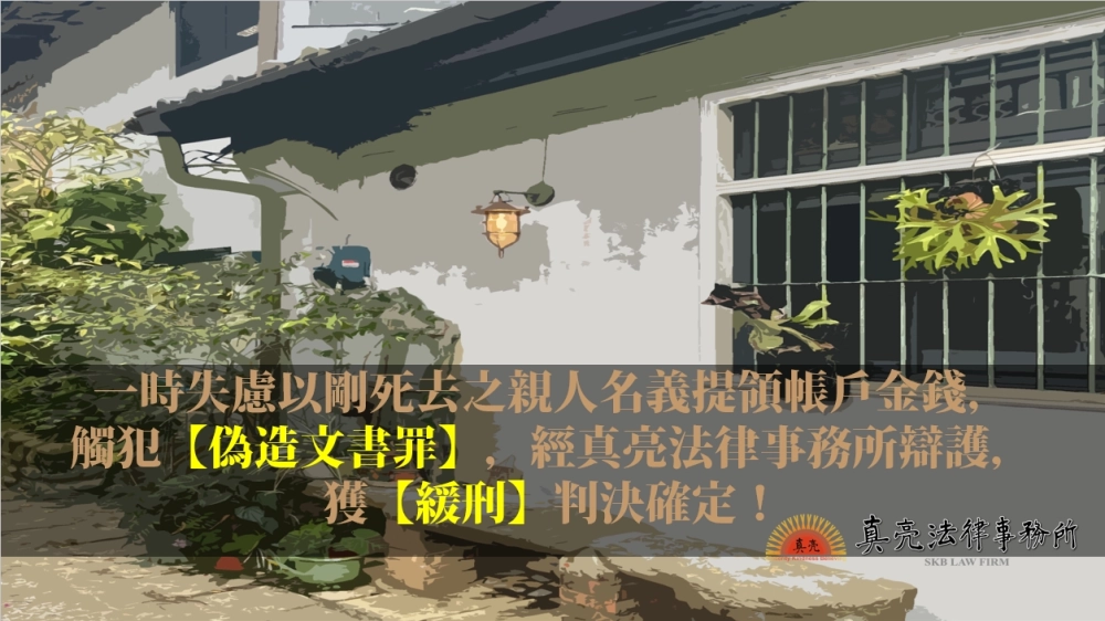 「一時失慮以剛死去之親人名義提領帳戶金錢,觸犯【偽造文書罪】,經真亮法律事務所辯護,獲【緩刑】判決確定!」由真亮法律事務所製作,以創用CC 姓名標示-非商業性-相同方式分享 4.0 國際 授權條款釋出。