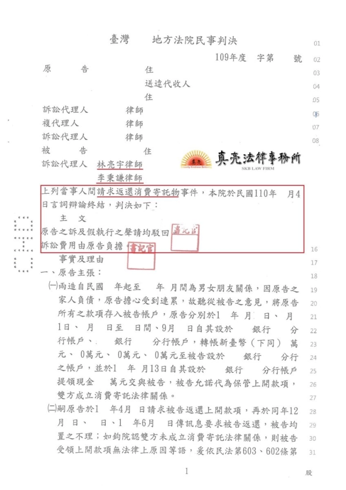 近期真亮法律事務所承辦一個相關案件,當事人與女友交往過程,因為共同投資、借款等原因,有很多金錢上的往來,而分手之後,本來好聚好散相安無事,豈料,對方心有不甘,認為還有很多金錢以消費寄託的方式寄託在我方,因此對我方提出返還消費寄託金錢的訴訟。