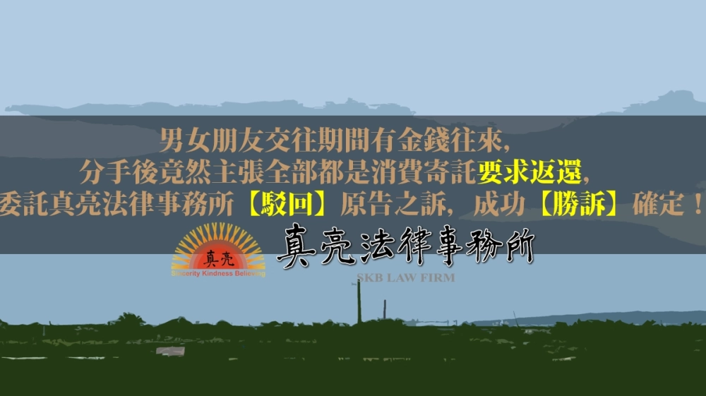 「男女朋友交往期間有金錢往來,分手後竟然主張全部都是消費寄託要求返還,委託真亮法律事務所【駁回】原告之訴,成功【勝訴】確定!」由真亮法律事務所製作,以創用CC 姓名標示-非商業性-相同方式分享 4.0 國際 授權條款釋出。