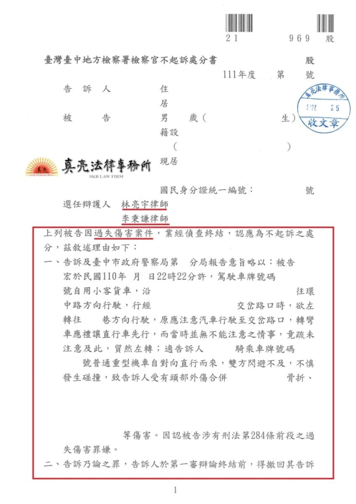商品開車不幸發生事故,遭提告【過失重傷罪】,經真亮法律事務所協助,獲判決【不受理】確定!
