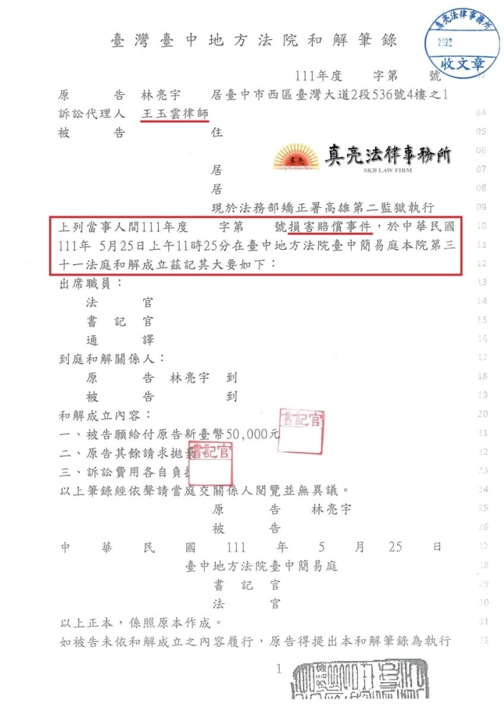「真亮法律事務所遭到他人偽造印章而受損害,經林亮宇律師,提請【刑事附帶民事訴訟】,獲得【賠償】確定!