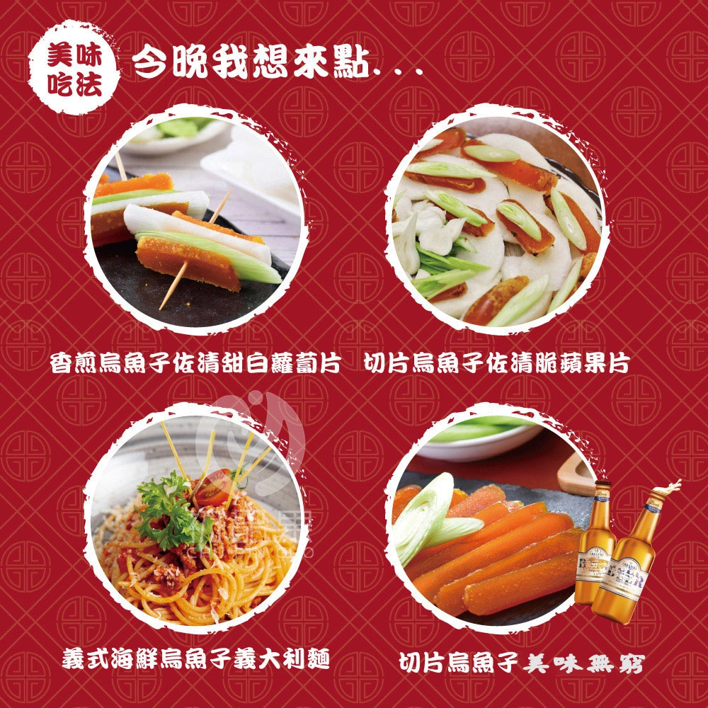 (4)烏魚子天然成長出貨,每片魚卵大小色澤可能都會略有不同,有腥味是正常的,無法接受海鮮產品有腥味的客人,請不要下單。