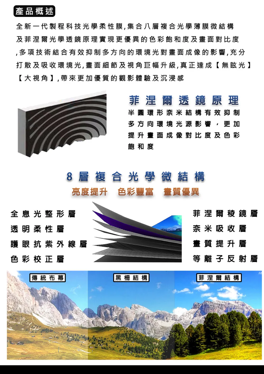 幕面採用最新8層複合光學薄膜微結構,僅對特定角度的投影機入射光進行靶向反射,非呈像角度的環境光則被另側的吸光塗層吸收,且不發生衍射,即使在白天,無需拉窗簾,無需關燈,依然呈現色彩飽和、層次豐富的投影畫面。
