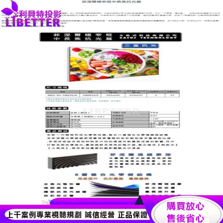 商品卡色式 CASOS MD5-SH-100(16:9) 100吋 菲涅爾極窄框中長焦抗光幕