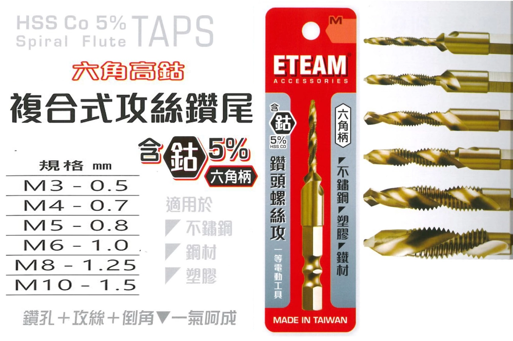 – 前段鑽孔,後段攻牙,快速加工不需換工具
