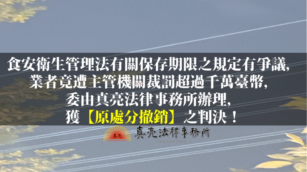 商品食品安全衛生管理法有關保存期限之規定有爭議,業者原遭主管機關裁罰超過新臺幣一千萬,在獲【原處分撤銷】之判決之後,但卻改裁罰4百多萬,經委託真亮法律事務所,幾乎全遭撤銷!