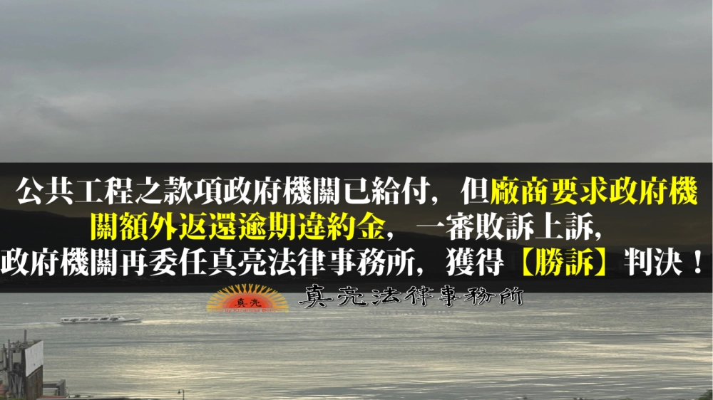 「公共工程之款項政府機關已給付,但廠商要求政府機關額外返還逾期違約金,一審敗訴上訴,政府機關再委任真亮法律事務所,獲得【勝訴】判決!」由真亮法律事務所製作,以創用CC 姓名標示-非商業性-相同方式分享 4.0 國際 授權條款釋出。