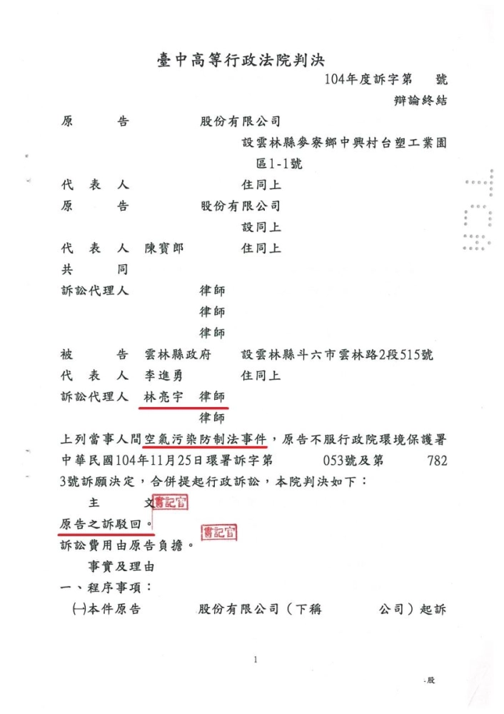 商品鍋爐汽電共生業者有關空氣污染防制法提起行政訴訟,真亮法律事務所受雲林縣政府委託,臺中高等行政法院判決【勝訴】確定