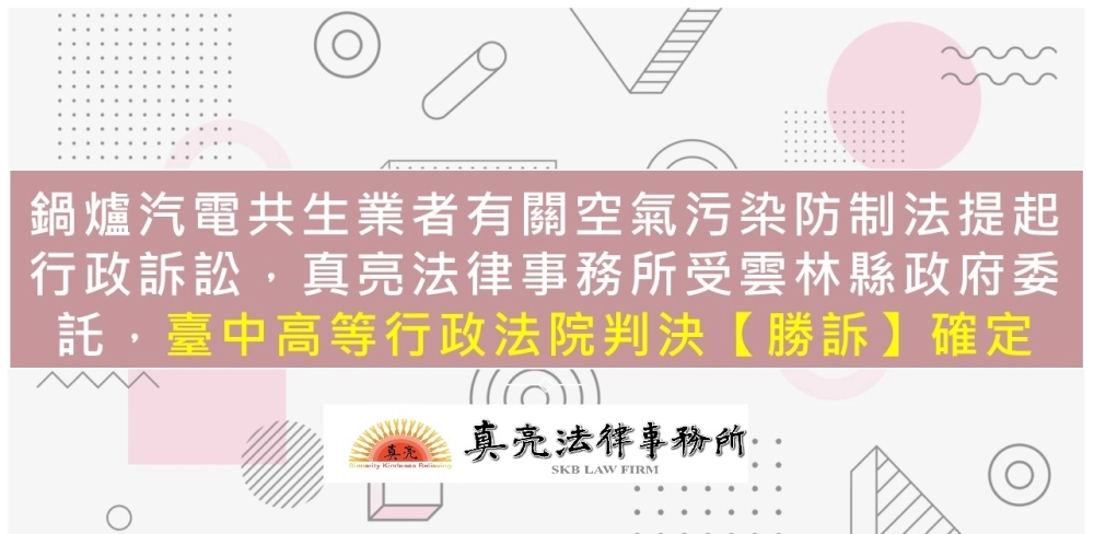 「鍋爐汽電共生業者有關空氣污染防制法提起行政訴訟,真亮法律事務所受雲林縣政府委託,臺中高等行政法院判決【勝訴】確定」由真亮法律事務所製作,以創用CC 姓名標示-非商業性-相同方式分享 4.0 國際 授權條款釋出。