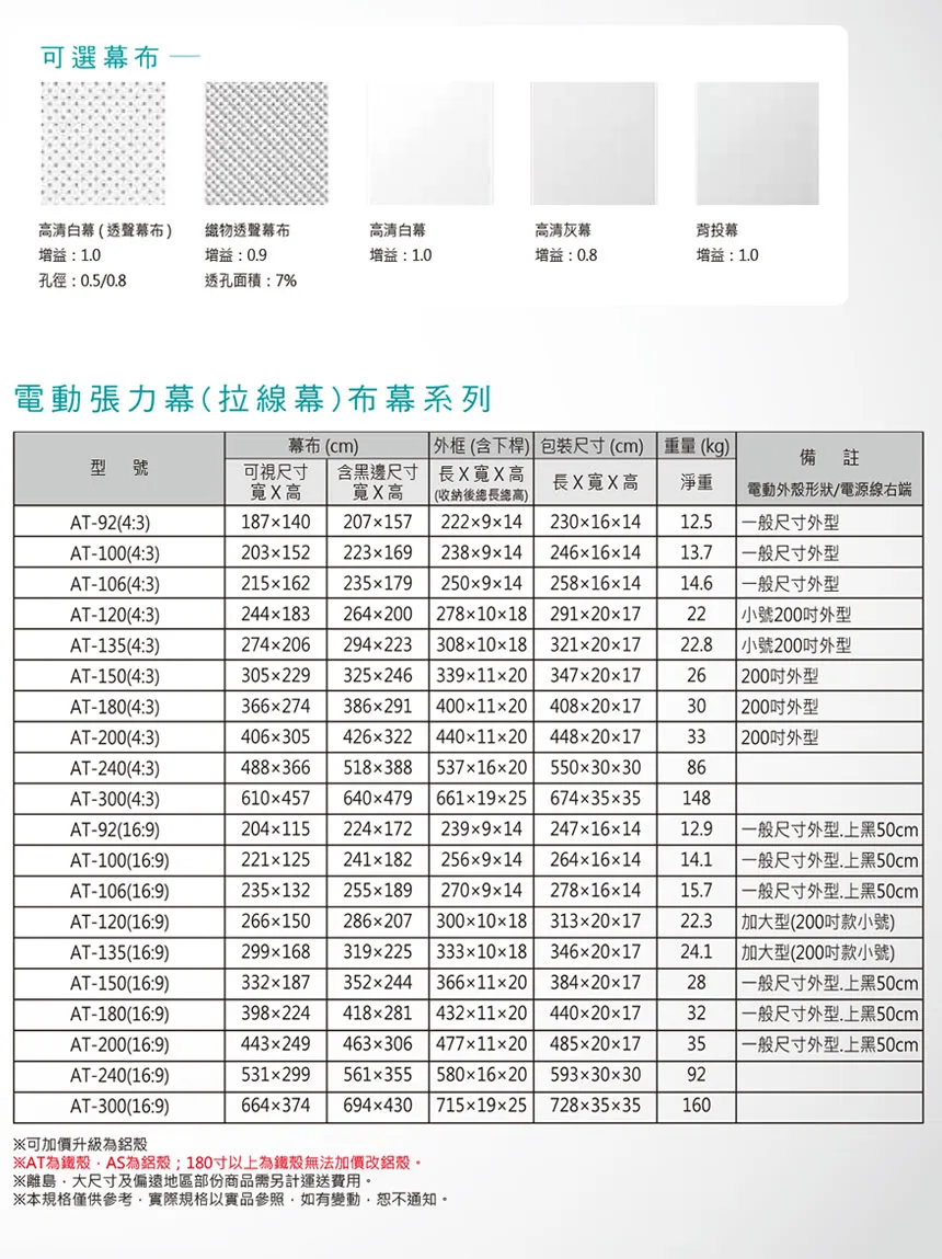 商品卡色式 CASOS AT-120(4:3) 120吋 標準型電動繃緊幕線拉幕