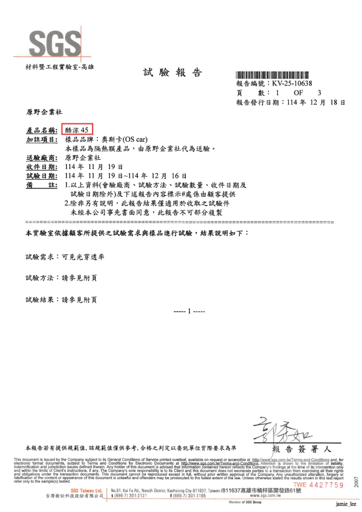 為協助車主在日常用車情境下,同時兼顧清晰視野與隔熱舒適性, 奧斯卡 酷涼系列已委由SGS 台灣依 ISO 9050 國際標準,進行 可見光穿透率(VLT)試驗, 並整理重點測試資訊供消費者選購時參考。