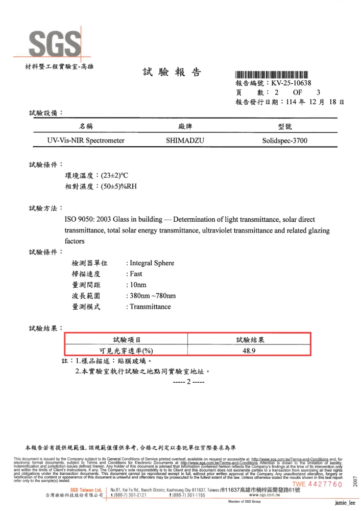 - SGS 試驗結果為指定送測樣品之量測數據, 實際貼膜後透光率仍可能因玻璃條件與施工方式而有所差異。