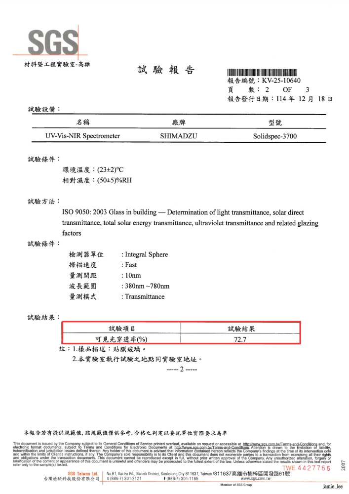 - SGS 試驗結果為指定送測樣品之量測數據,實際貼膜後透光率仍可能因玻璃條件與施工方式而有所差異。