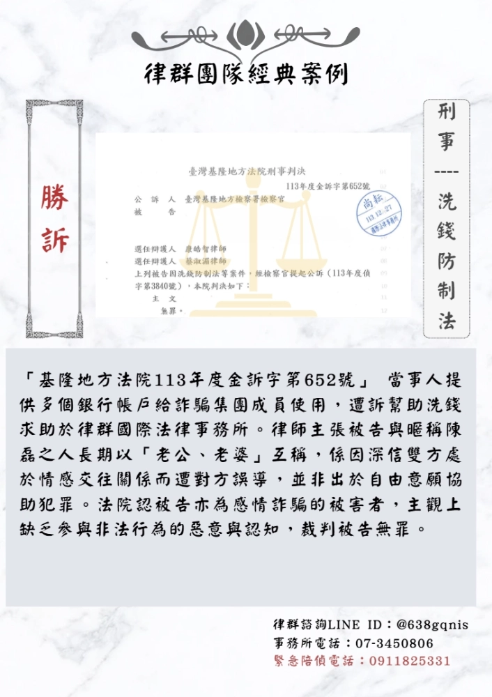 「基隆地方法院113年度金訴字第652號」 當事人提供多個銀行帳戶給詐騙集團成員使用,遭訴幫助洗錢求助於律群國際法律事務所。律師主張被告與暱稱陳磊之人長期以「老公、老婆」互稱,係因深信雙方處於情感交往關係而遭對方誤導,並非出於自由意願協助犯罪。法院認被告亦為感情詐騙的被害者,主觀上缺乏參與非法行為的惡意與認知,裁判被告無罪。