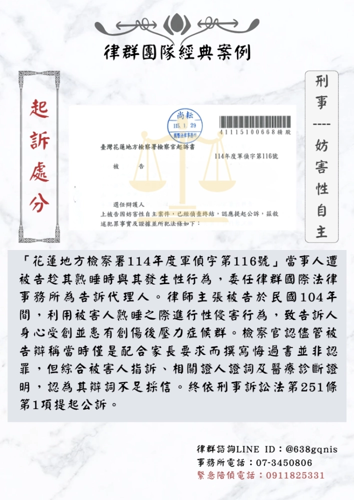 「花蓮地方檢察署114年度軍偵字第116號」當事人遭被告趁其熟睡時與其發生性行為,委任律群國際法律事務所為告訴代理人。律師主張被告於民國104年間,利用被害人熟睡之際進行性侵害行為,致告訴人身心受創並患有創傷後壓力症候群。檢察官認儘管被告辯稱當時僅是配合家長要求而撰寫悔過書並非認罪,但綜合被害人指訴、相關證人證詞及醫療診斷證明,認為其辯詞不足採信。終依刑事訴訟法第251條第1項提起公訴。