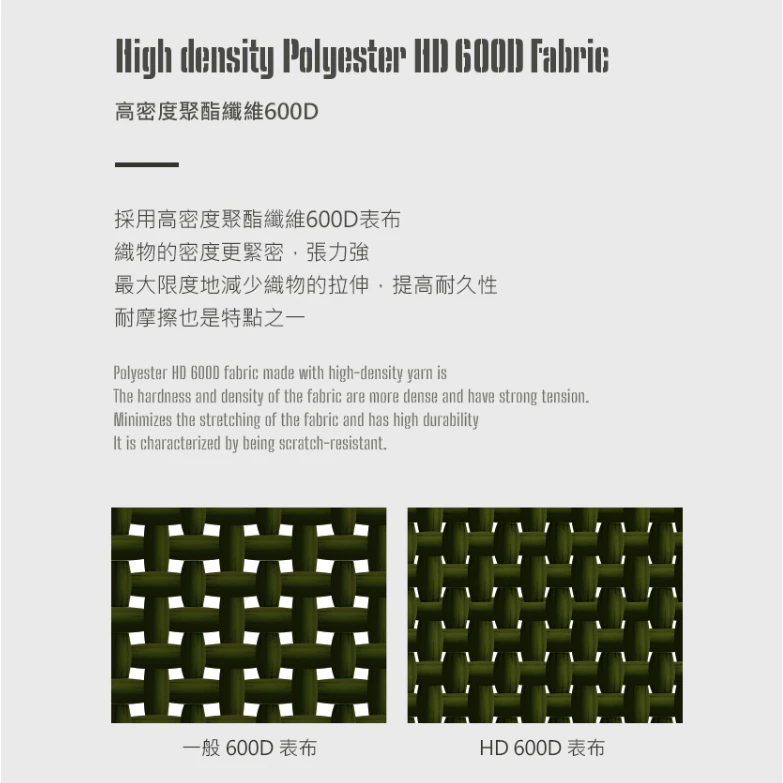 🔹採用高密度聚酯纖維600D表布,織物的密度更緊密,張力強,最大限度地減少織物的拉伸,提高耐久性