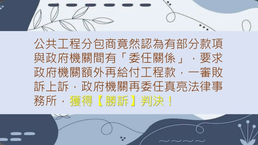 • 公共工程分包商竟然認為有部分款項與政府機關間有「委任關係」,要求政府機關額外再給付工程款,一審敗訴上訴,政府機關再委任真亮法律事務所,獲得【勝訴】判決!