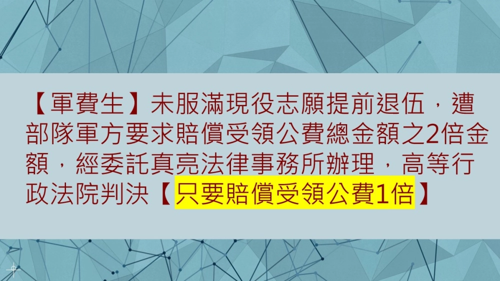 近期真亮法律事務所承辦一個相關案件,有一位民眾在107年之前,高中畢業進入軍事院校就讀,為軍費生。畢業服現役滿1年後,依陸海空軍軍官士官服役條例提出申請提前退伍,並由部隊審定通過,核定提前退伍。但部隊以該民眾應服現役月數為120月,退伍時未服滿役期,依「陸海空軍軍官士官未服滿最少服役年限志願申請退伍賠償辦法」(為107年11月29日訂定)第3條規定,應以就讀預備學校與接受基礎教育、分科(專長)教育、國外受訓及全時進修期間,所受領公費待遇、津貼及訓練費用合計總金額之2倍金額計算後,依應服滿與未服滿招生簡章所定役期之比率賠償,高達新臺幣近190萬元。