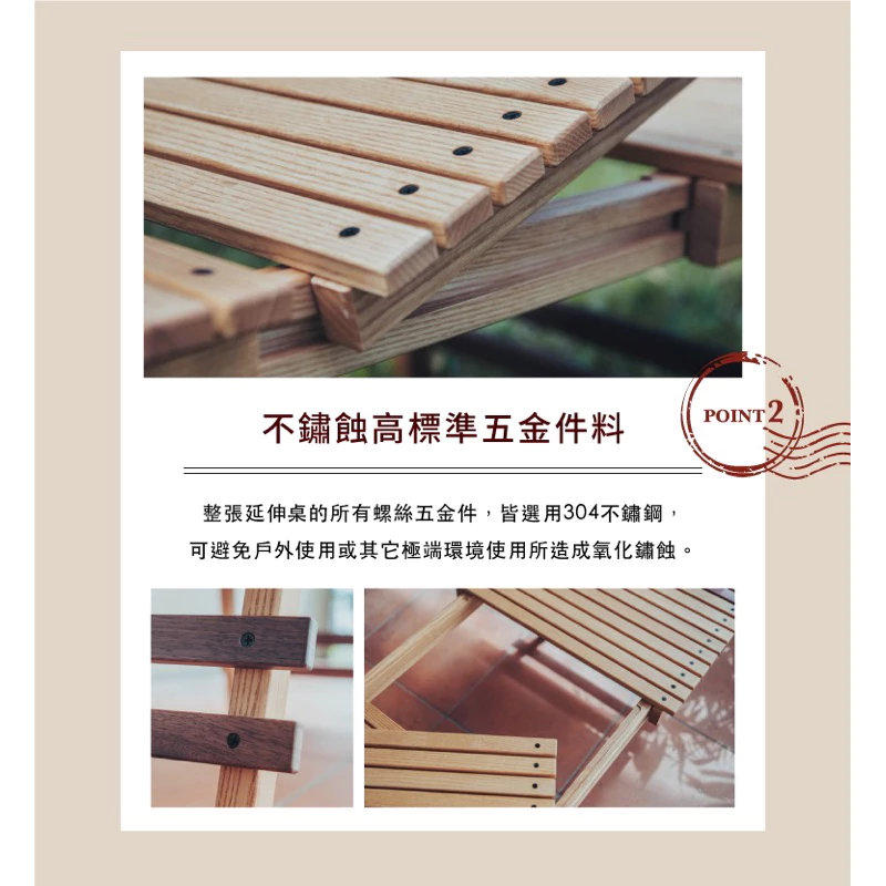 其延伸設計為雙邊拉展,使桌體展開使用時更為方便與穩固。桌板為25 mm的細木條拼接,做工精緻且細膩,講究每一道工序,嚴格管控公差,最外層保護漆料全面升級,防水性大幅提升,同時也明顯降低木材變形率,讓整體達到高平整度,擺放時更穩,使用起來更是流暢的十分有感。