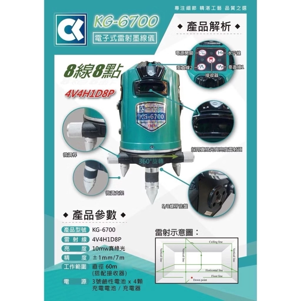 商品【飆破盤】CK 雷射 KG-86 電子式8線綠光墨線儀 4V4H1D8P 雷射墨線儀 水平儀 墨線儀 工程 測量 裝潢