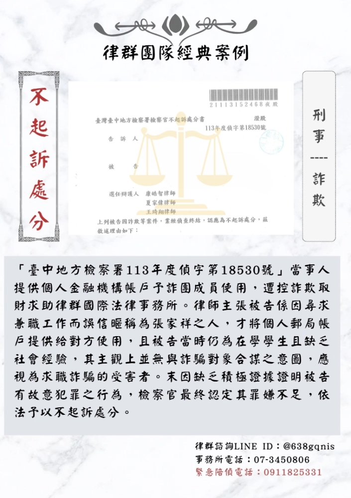 「臺中地方檢察署113年度偵字第18530號」當事人提供個人金融機構帳戶予詐團成員使用,遭控詐欺取財求助律群國際法律事務所。律師主張被告係因尋求兼職工作而誤信暱稱為張家祥之人,才將個人郵局帳戶提供給對方使用,且被告當時仍為在學學生且缺乏社會經驗,其主觀上並無與詐騙對象合謀之意圖,應視為求職詐騙的受害者。末因缺乏積極證據證明被告有故意犯罪之行為,檢察官最終認定其罪嫌不足,依法予以不起訴處分。