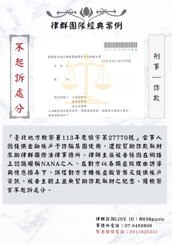 「臺北地方檢察署113年度偵字第27770號」當事人因提供金融帳戶予詐騙集團使用,遭控幫助詐欺取財求助律群國際法律事務所。律師主張被告係因在網路上認識暱稱NANA之人,在對方以各類虛假理由誘導與情感操弄下,誤信對方才轉帳虛擬貨幣及提供帳戶資訊,被告主觀上並無幫助詐欺取財之犯意。獲檢察官不起訴處分。