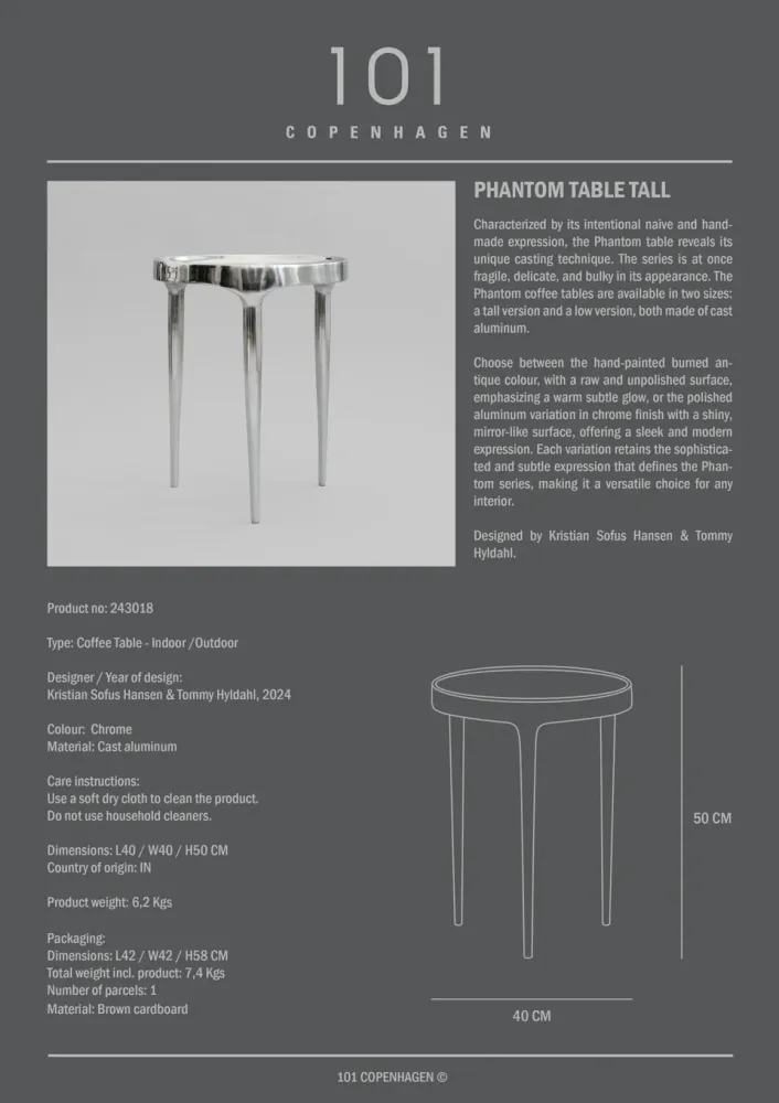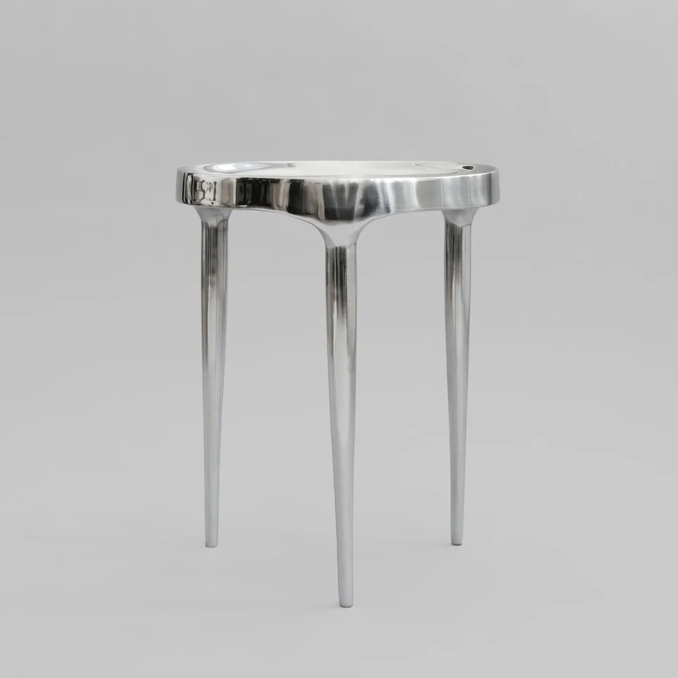 Phantom茶几有高矮兩種版本,鍍鉻光面鋁合金款擁有光滑如鏡的亮面,透過其亮眼的反光效果,呈現現代感的簡約美,增添一種時尚前衛的氣質,同時保留了Phantom系列所特有的精緻與微妙的設計語言。