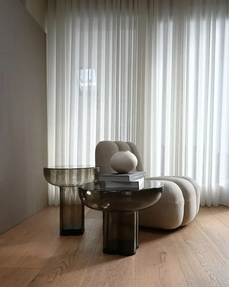 靈感來自野性粗獷的野獸派建築,設計重點在結構性柱體,凸顯柱狀設計之美並融合極簡美學,厚實的纖維混凝土桌腿讓桌面呈現懸浮感,減少繁複細節以強調設計本質。提供兩種尺寸,可單獨作為邊桌,也可搭配作為茶几使用,適合多樣室內環境。