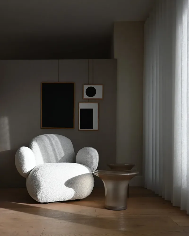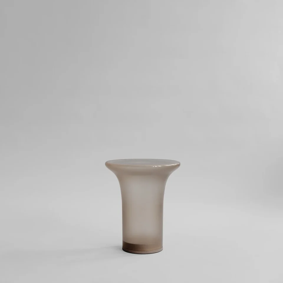Trumpet 邊桌提供兩款獨特色調選擇。煙霧森林色(Smoked Forest) 透出深色透明質感,帶有微妙的綠色調;霧沙色(Smoked Desert) 則呈現獨特的暖灰色,略帶霧面通透效果,彷彿晨霧輕罩,增添神秘感。其百搭設計使 Trumpet 成為多種空間的理想亮點,適合多樣式內環境。