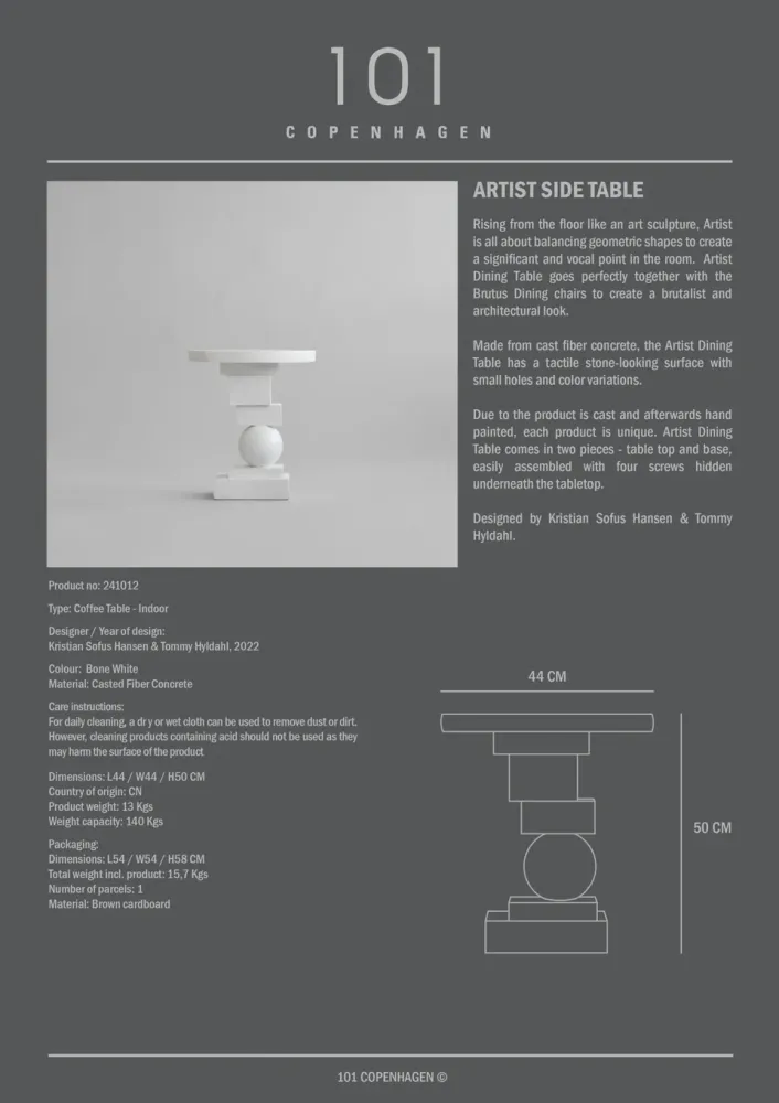 Artist餐桌與Brutus餐椅完美搭配,打造出粗獷主義和建築風格的外觀。而Artist邊桌則是Toe椅系列的理想搭檔。餐桌由鑄造纖維混凝土製成,表面呈現出石材般的質感,並帶有自然孔洞與色彩變化。每一件都是手工塗漆製成,具有獨特性。