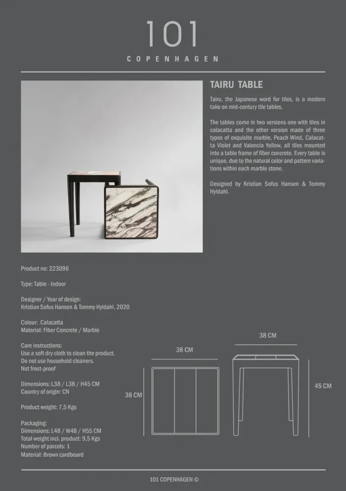 這款桌子有兩種款式,一種是由Calacatta大理石瓷磚製成,另一種則由三種精緻的大理石製成,包括Peach Wind、Calacatta Violet和Valencia Yellow,這些瓷磚均嵌入纖維混凝土框架中,每張桌子都是獨一無二的,因每塊大理石都有自然的顏色和紋理變化。