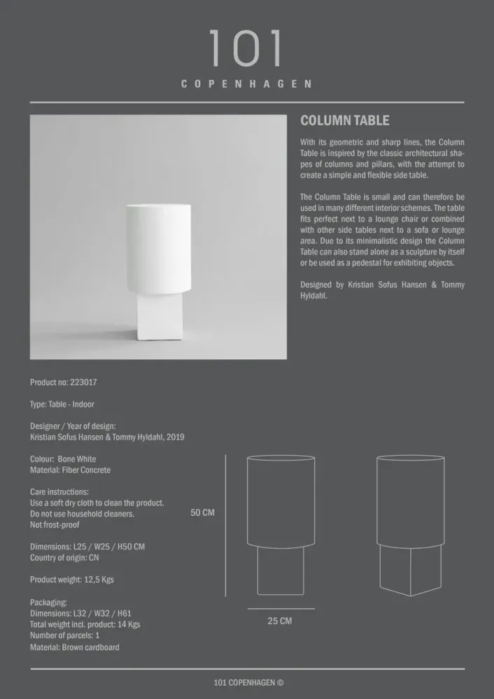 柱桌很小,因此可以用於許多不同的室內方案。這張桌子非常適合放在躺椅旁邊,也可以與沙發或休息區旁邊的其他邊桌組合使用。由於其簡約的設計,柱桌本身也可以作為雕塑獨立存在,也可以用作展示物品的基座。
