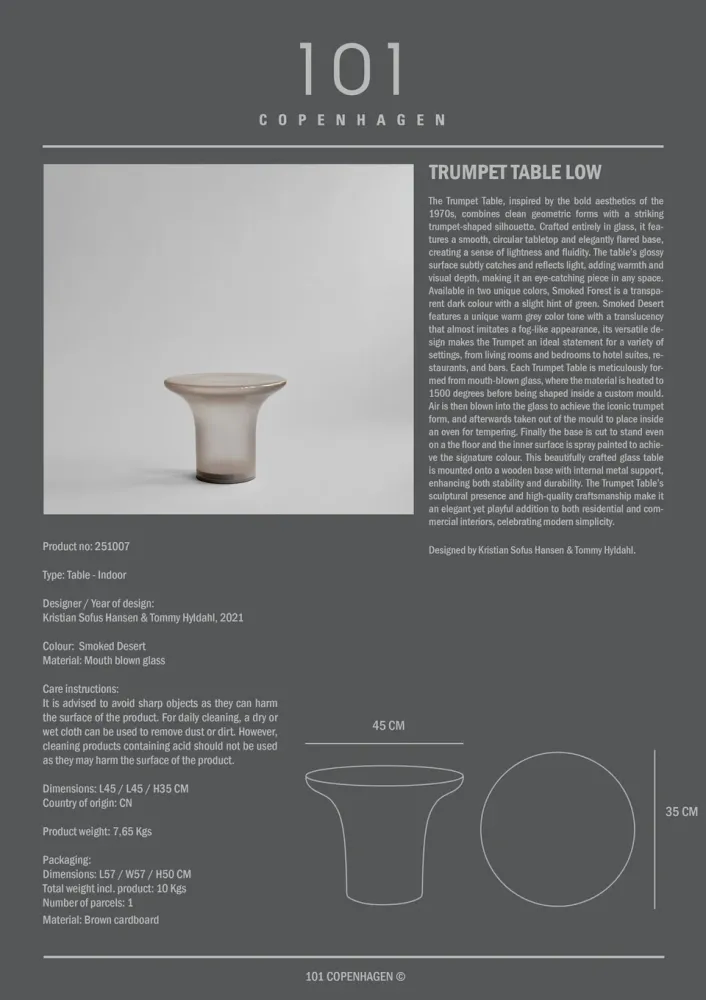 Trumpet 邊桌提供兩款獨特色調選擇。煙霧森林色(Smoked Forest) 透出深色透明質感,帶有微妙的綠色調;霧沙色(Smoked Desert) 則呈現獨特的暖灰色,略帶霧面通透效果,彷彿晨霧輕罩,增添神秘感。其百搭設計使 Trumpet 成為多種空間的理想亮點,適合多樣式內環境。