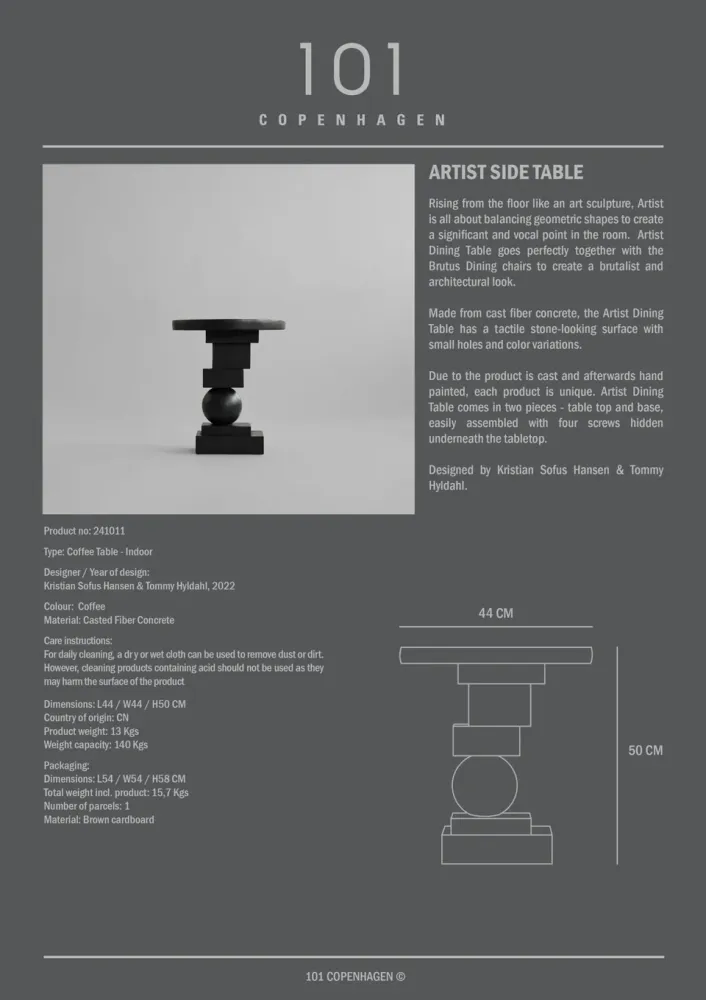 Artist象徵著一個藝術雕塑般的作品,專注於幾何形狀的平衡,創造出房間裡的視覺焦點。此系列包括餐桌與邊桌,餐桌分為兩部分,邊桌則為整體鑄造。