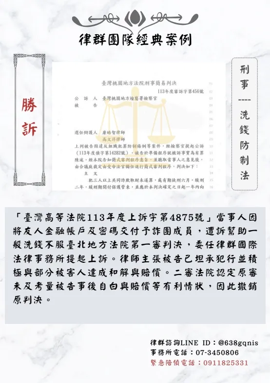 「臺灣高等法院113年度上訴字第4875號」當事人因將友人金融帳戶及密碼交付予詐團成員,遭訴幫助一般洗錢不服臺北地方法院第一審判決,委任律群國際法律事務所提起上訴。律師主張被告已坦承犯行並積極與部分被害人達成和解與賠償。二審法院認定原審未及考量被告事後自白與賠償等有利情狀,因此撤銷原判決。
